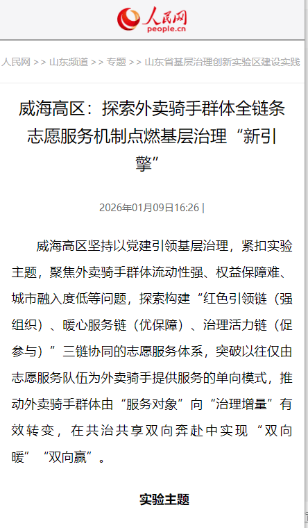 威海高区正在推进省级下层管理立异尝试区扶植过程中,整合社区、商家、居平易近、外卖骑手等多方力量,构成了一套行之无效、可复制可推广的下层管理模式,