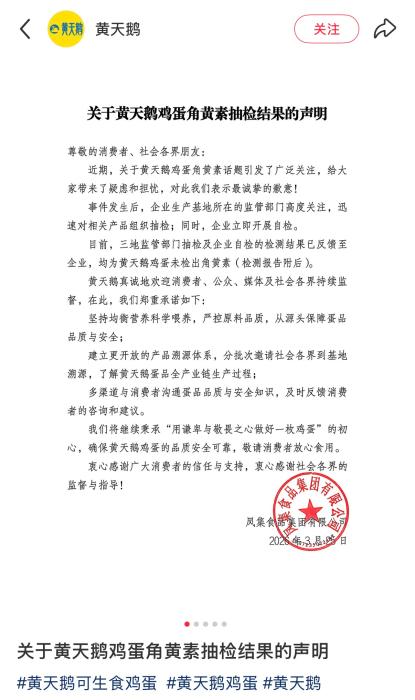 黄天鹅发布角黄素抽检成果声明并附检测演讲。收集关心核心从“角黄素为天然仍是人工添加”转向“多次检测成果为何不分歧”。